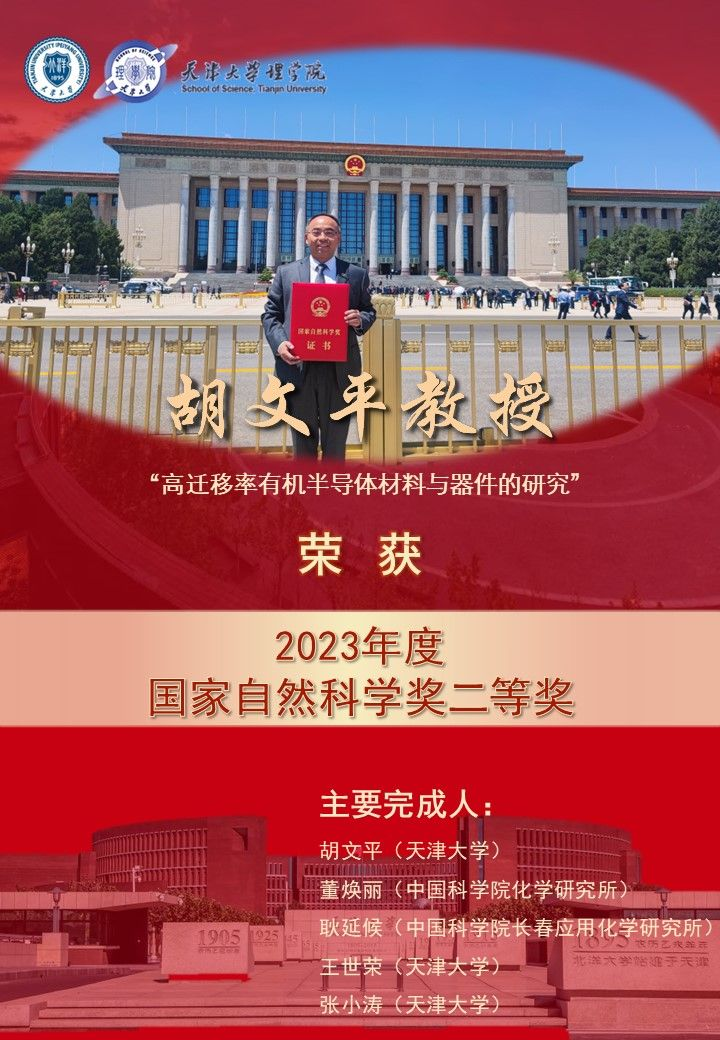 6月24日上午,2023年度国家科学技术奖公布,评选出国家最高科学技术奖2人,国家自然科学奖49项,国家技术发明奖62项,国家科学技术进步奖139项,中华人民共和国国际科学技术合作奖10人。由天津大学作为第一完成单位,理学院胡文平教授牵头的“高迁移率有机半导体晶体材料与器件”项目获2023年度国家自然科学奖二等奖。