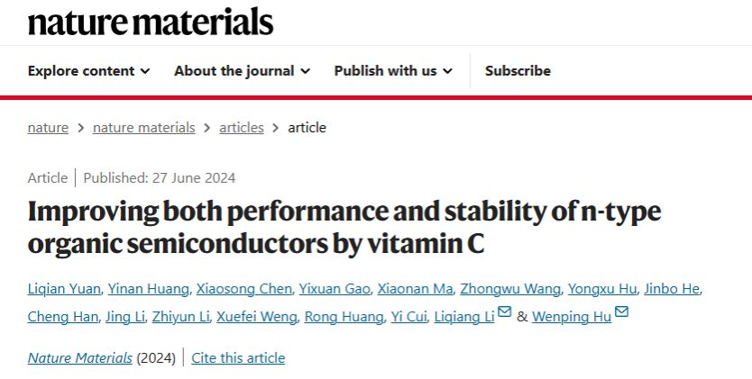 近日,天津大学理学院胡文平-李立强团队在n型有机半导体的稳定性研究中取得新进展。研究成果发布在国际著名期刊Nature Materials《自然·材料》上,题目为“Improving both performance and stability of n-type organic semiconductors by vitamin C”。论文通讯作者是胡文平教授和李立强教授,第一作者是苑力倩博士,黄忆男博士和陈小松副研究员。