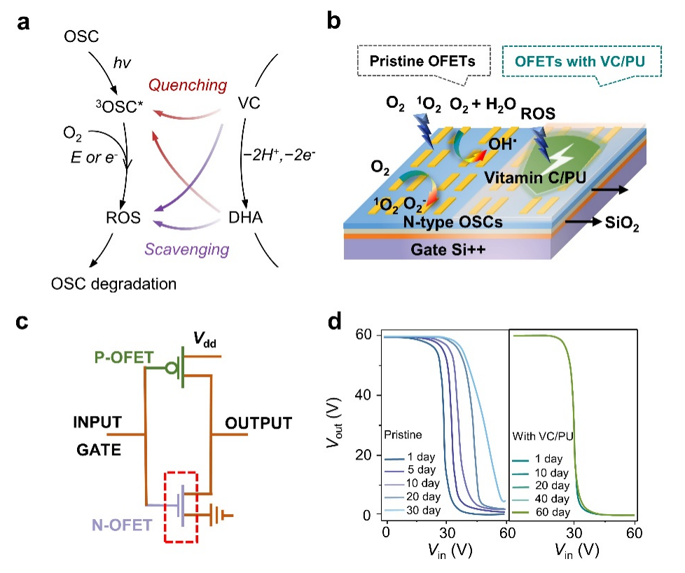 为了攻克这一难题,胡文平-李立强团队报道了一种利用维生素C稳定n型有机半导体的普适性策略,大幅提升了材料和器件的性能与稳定性。维生素C在级联反应过程中通过牺牲性的氧化反应和非牺牲性的三重态猝灭作用来清除材料内活性氧物种并抑制其再生,从而持久保护半导体分子免受氧化性损伤,并钝化材料和器件内潜在的电子陷阱。受到维生素C保护的n型有机场效应晶体管(OFETs)性能得到了很大的改善,电子迁移率最高增加了38倍,操作稳定性和抗光氧化能力大幅提升,其优异的性能可在空气中保持超过255天。这种抗氧化策略在大面积OFETs阵列中表现出优异的均匀性和批次重复性。利用该策略制备互补型反相器同样展现出更高的增益和更强的环境稳定性。这项研究为攻克n型有机半导体的稳定性难题提供了全新的思路和方法。维生素C作为其中的关键材料,其环保、低成本、使用便捷的特点,使该策略具有大规模工业化的潜力。