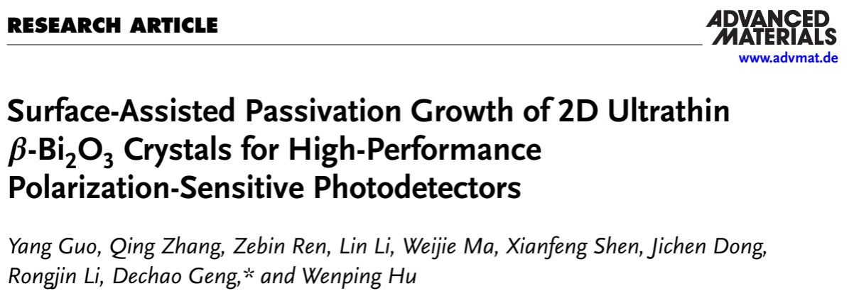 在材料科学的广阔领域中,二维非层状材料(NLMs)因其独特的表面结构和光明的应用前景而备受关注。这些材料拥有丰富的表面悬挂键和高度活性的表面,能够促进电荷载流子的快速传输和分离,从而提高电荷载流子的迁移率和电导率。然而,由于NLMs固有的各向同性共价键,直接合成超薄和大面积的2D NLMs仍然是一个巨大的挑战。在这一背景下,研究人员面临着平衡NLMs的超薄厚度和广阔晶体尺寸的挑战,这对于探索性能和器件集成具有重要意义。因此,开发一种新的增长方法以促进NLMs的减薄,从而获得超薄和大尺寸的NLMs变得至关重要。在这项研究中,研究人员开发了一种表面辅助钝化生长策略,通过使用Bi2Se3作为辅助剂来引导2D超薄β-Bi2O3晶体的生长。相关成果以“Surface-Assisted Passivation Growth of 2D Ultrathin β-Bi2O3 Crystals for High-PerformancePolarization-Sensitive Photodetectors”为题发表在《Advanced Materials》上,第一作者为郭洋。