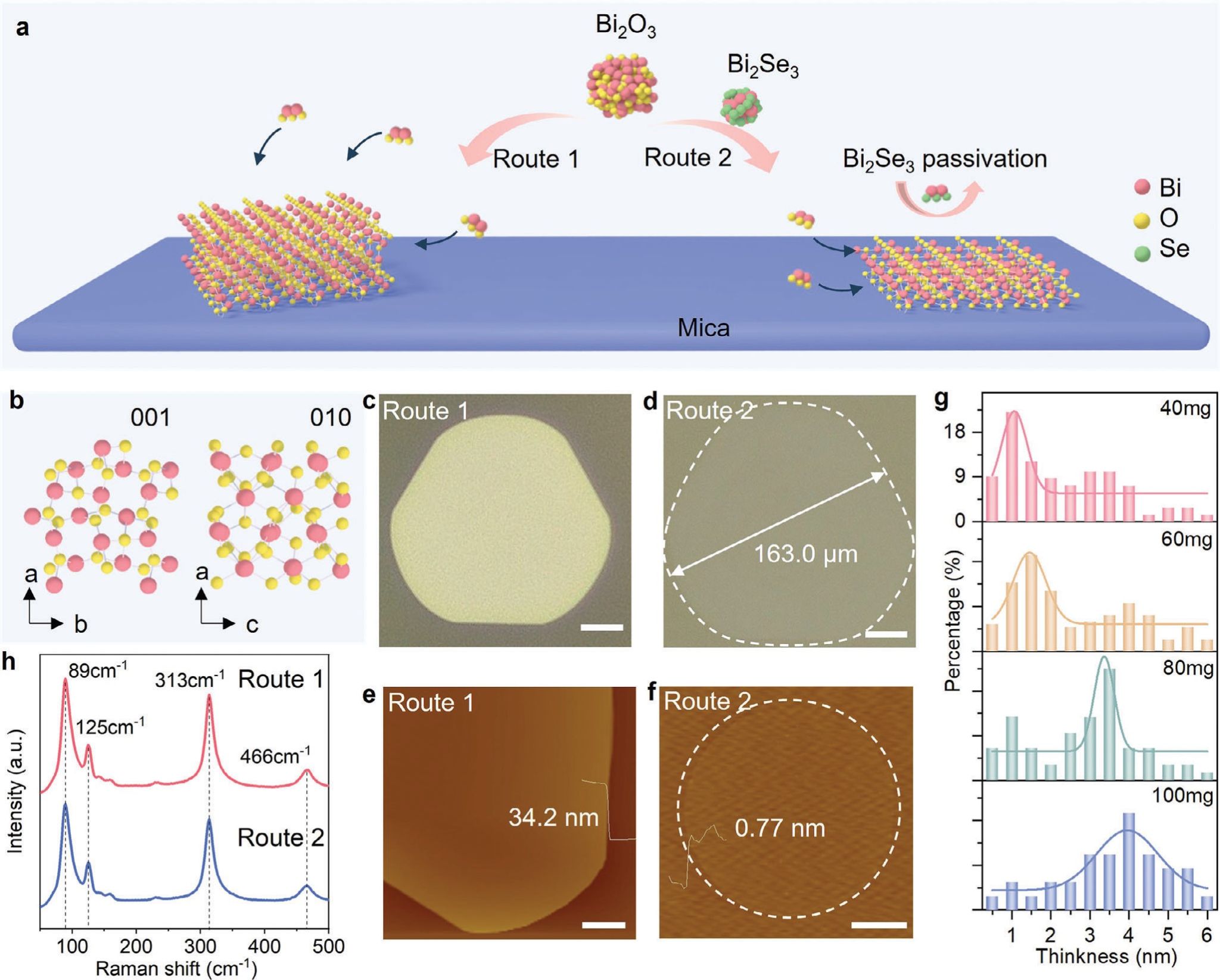 图1:通过表面辅助钝化生长策略控制合成2D超薄β-Bi2O3片层。展示了β-Bi2O3的两种生长路径,以及不同路径下β-Bi2O3的原子结构模型、光学显微镜图像、AFM图像和厚度分布统计。