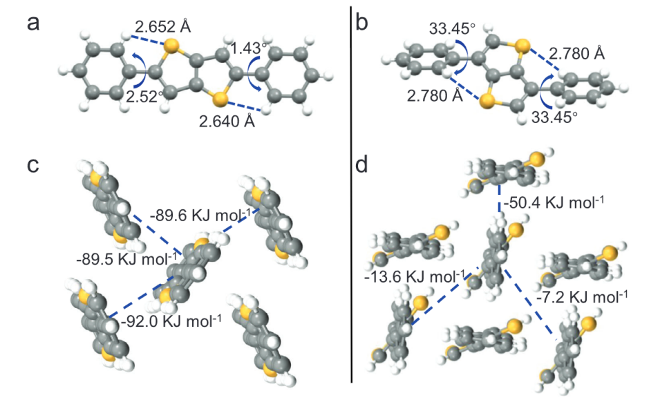 2,5-DPTT(图a)和3,6-DPTT(图b)分子结构示意图及分子间势能示意图(图cd)