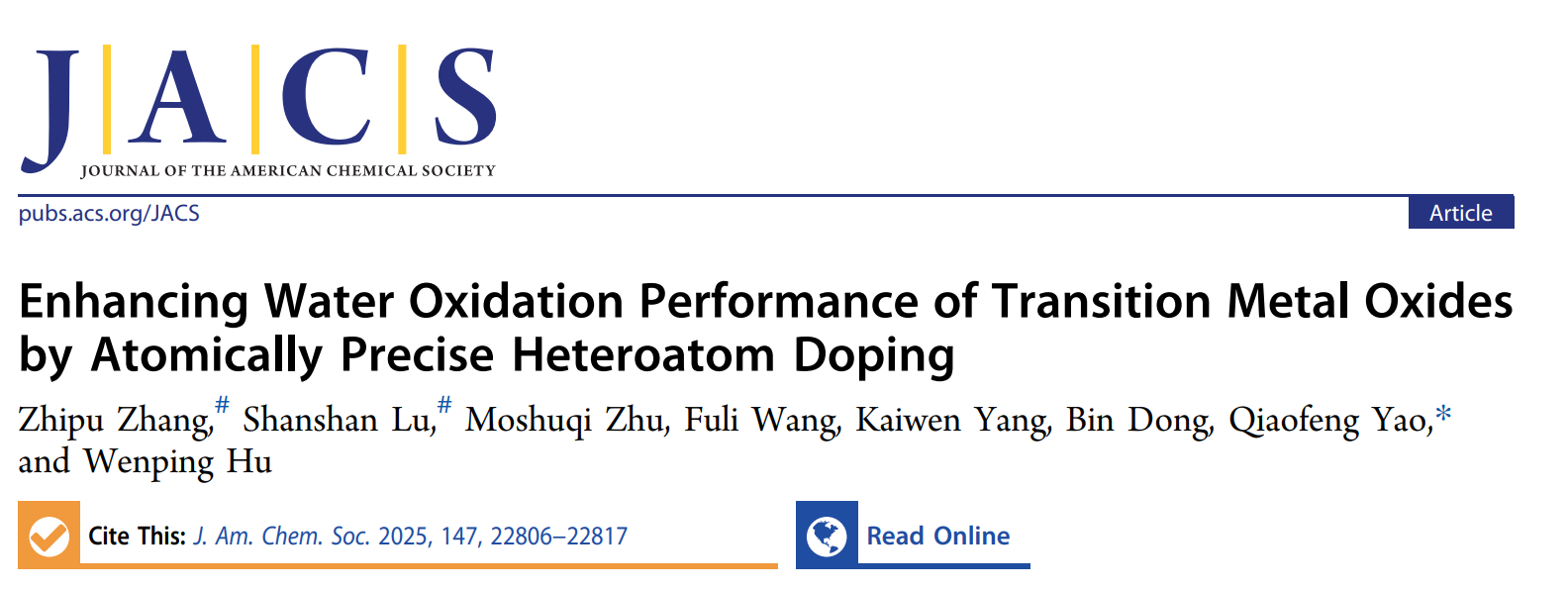 杂原子掺杂是一种有效策略,可用于调控非贵金属过渡金属(如Fe、Co和Ni)氧化物的电子结构和稳定性,从而实现经济高效析氧反应(OER)。然而,传统的掺杂方法通常会导致不可预测且不均匀的掺杂位点,甚至引发相分离。天津大学胡文平、姚桥峰团队在Journal of the American Chemical Society期刊发表题为“Enhancing Water Oxidation Performance of Transition Metal Oxides by Atomically Precise Heteroatom Doping”的研究论文,张志普、卢珊珊为论文共同第一作者。