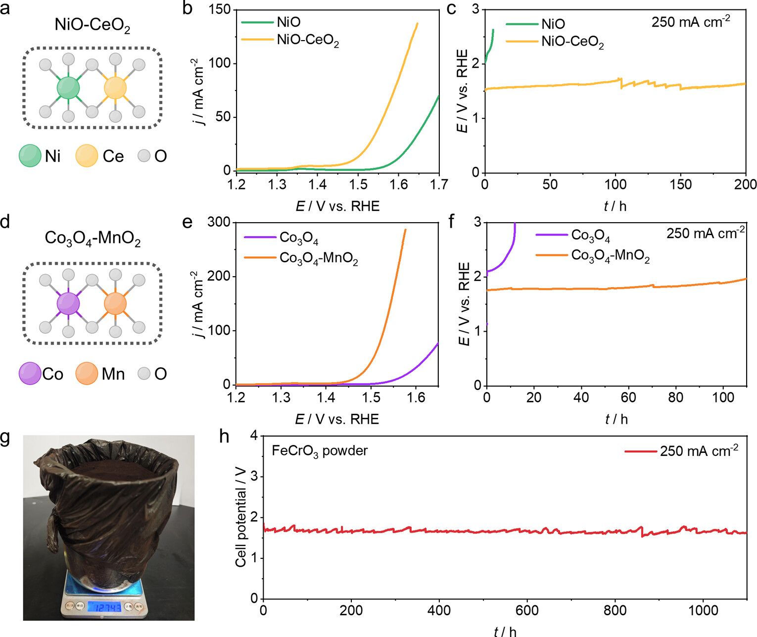 图2. (a) NiO-CeO₂的结构示意图。(b) NiO和NiO-CeO₂的LSV曲线。(c) NiO和NiO-CeO₂在电流密度为250 mA cm⁻²下的时间稳定性测试。(d) Co₃O₄-MnO₂的结构示意图。(e) Co₃O₄和Co₃O₄-MnO₂的LSV曲线。(f) Co₃O₄和Co₃O₄-MnO₂在电流密度为250 mA cm⁻²下的时间稳定性测试。(g) 千克级生产的FeCrO₃粉末催化剂的实物照片。(h) FeCrO₃粉末催化剂在AEMWE中电流密度为250 mA cm⁻²下的时间稳定性测试。