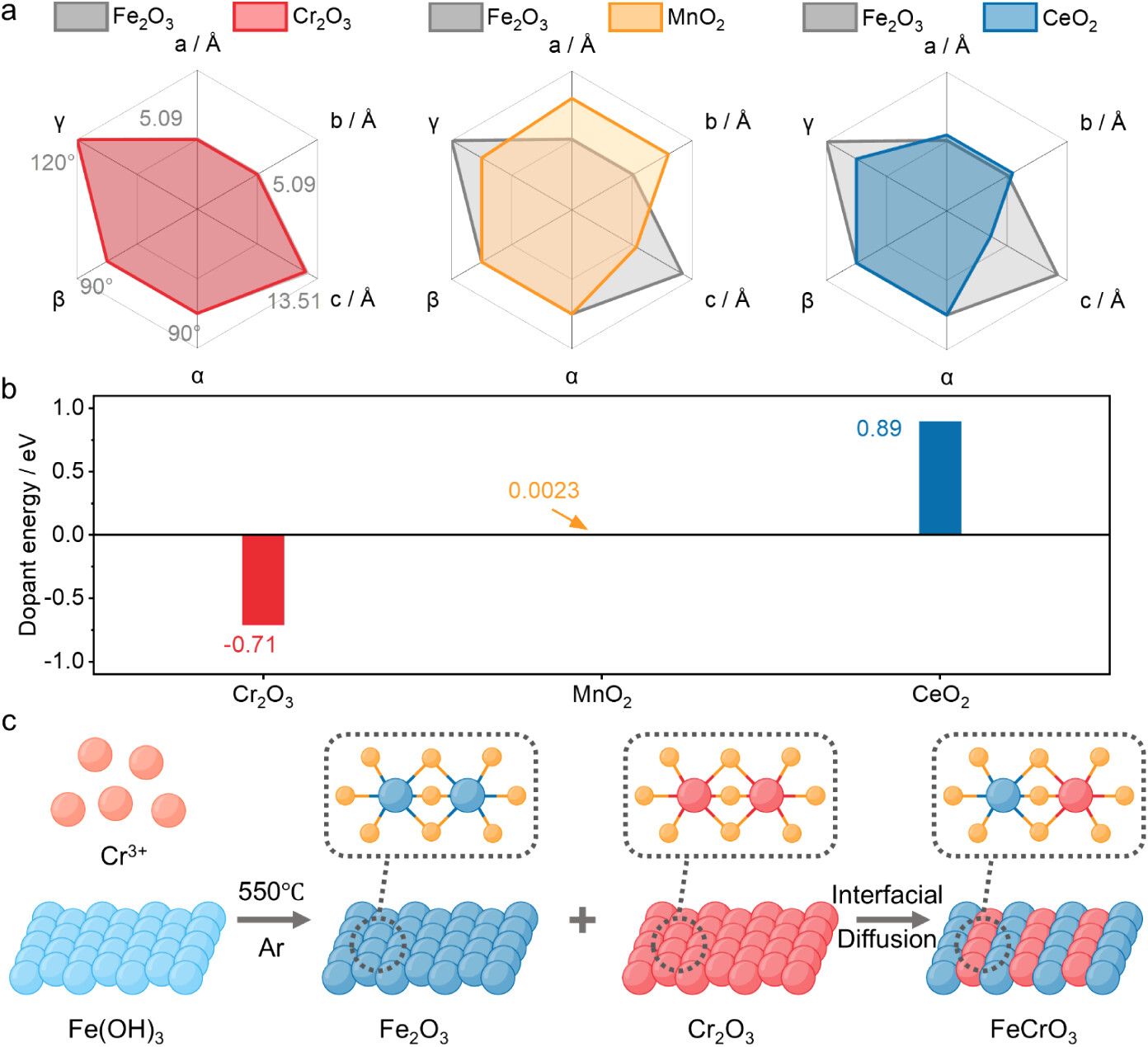 图1. (a) Fe₂O₃、Cr₂O₃、MnO₂和CeO₂的晶格参数比较。