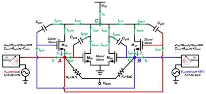 团队在研究过程中,深入剖析了毫米波频段场效应管(FET)的非线性相位偏移机制,建立了基于伪泰勒级数的谐波电流模型,首次揭示了二次谐波负反馈的相位特性及消除原理。通过将 Volterra-Wiener 非线性理论与电路设计结合,验证了 MPDC 结构中基波与二次谐波的线性 - 非线性叠加机制,为超宽带倍频器设计提供了坚实的理论支撑。