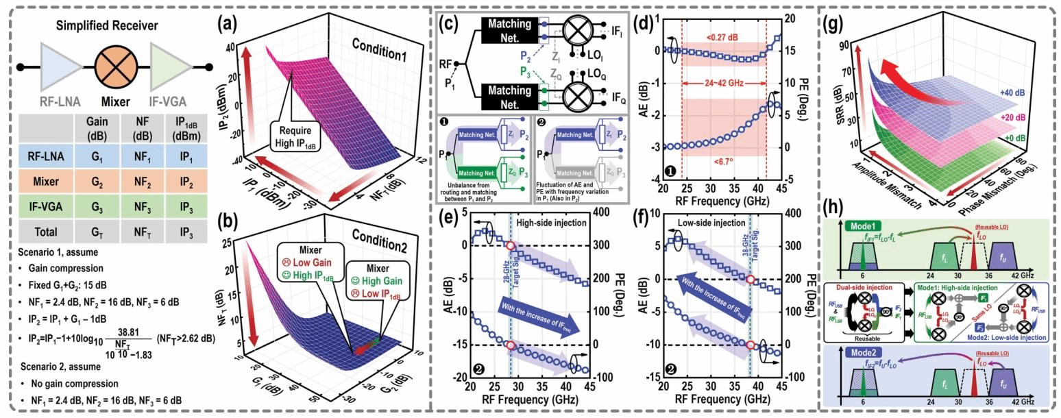 图1.基于简化通用接收机的两种场景(a)和(b);(c)基于传统哈特利架构的混频器射频通路示意图(d)P₂与 P₃之间随频率变化的仿真失配情况(e)高边注入、(f)低边注入模式下,基于特定目标频点的 P₂或 P₃引起的仿真失配情况(g)不同幅度和相位失配下的仿真边带抑制比(h)所提双频段下变频器的频率规划与设计理念