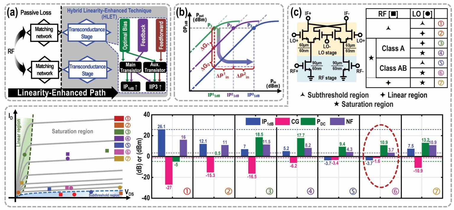 为解决线性度优化的单一性问题,团队融合“最优偏置+反馈+前馈”三重机制,提出HLET技术。将射频跨导级(RF stage)偏置为AB类(VGS 略高于阈值电压)、LO 开关级偏置为饱和区,在保证转换增益(CG)的同时,为线性增强奠定基础,实测IP₁dB较 Class A偏置提升2.3dBm;创新将跨导级漏极电感(LD)与源极退化电感(LS)通过磁耦合(耦合系数 KC)形成负反馈,通过调节KC动态优化等效跨导,使IP₁dB在28/37/39GHz分别达11.32/11.06/9.85dBm,较传统源极退化提升3.5dBm。HLET 技术首次实现IP₁dB与IIP3的同步突破,动态范围较同类设计扩大15%,可耐受强干扰信号而不出现失真。