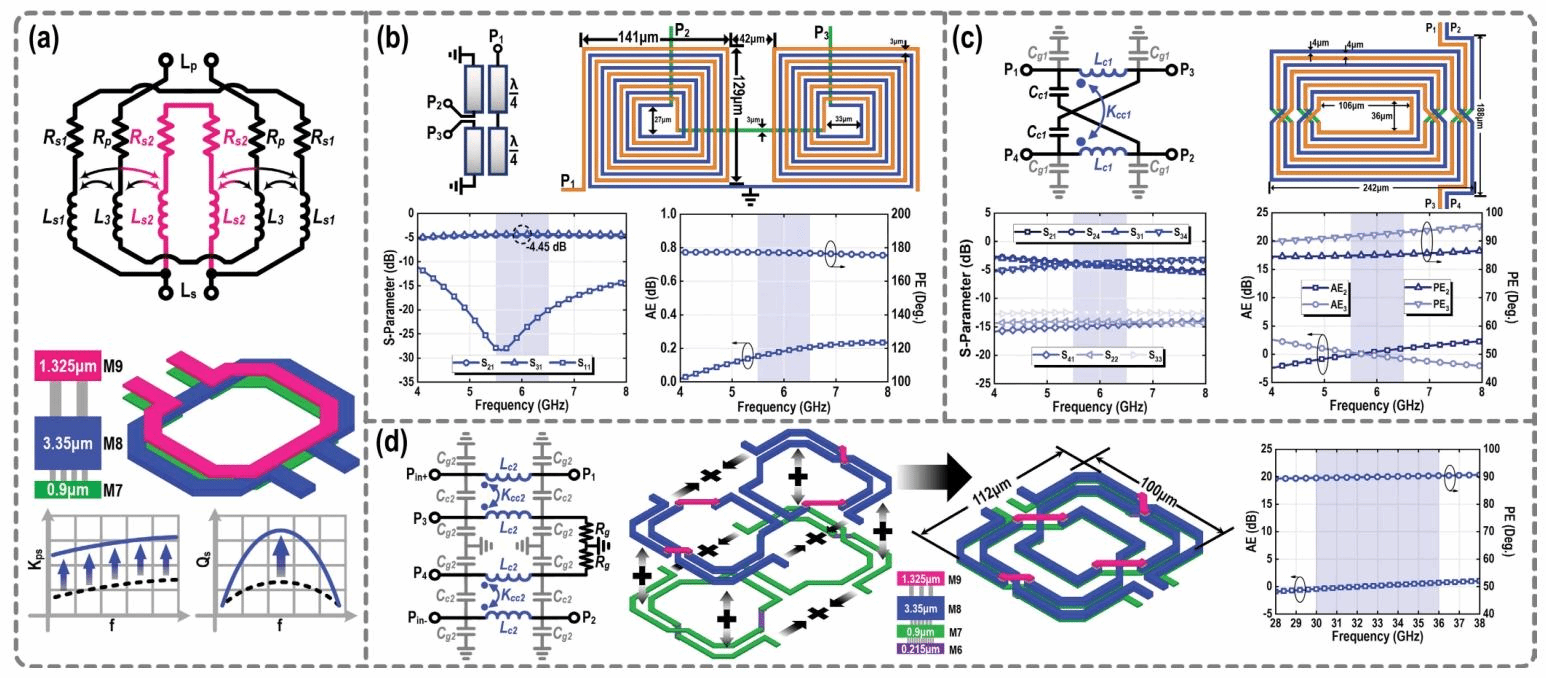 为实现双频段阻抗匹配与信号转换,团队设计系列新型无源组件,解决毫米波频段寄生效应难题。采用三层金属堆叠结构,相比传统边缘耦合变压器,耦合系数调节范围扩大40%,在24-42GHz频段内实现< -10 dB的反射系数(S₁₁),且底部绕组品质因数(Qs)提升25%;在IF频段采用单层厚金属螺旋结构,核心面积仅324×138μm²,幅度不平衡< 0.18dB、相位不平衡< 2.96°,实现差分-单端信号高效转换。