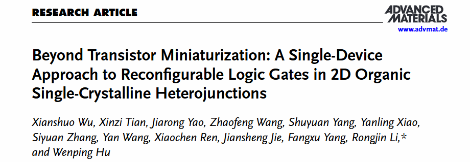 在柔性电子领域,有机电路技术的发展正推动着柔性电子的突破。然而,有机材料固有的脆弱性以及与传统光刻工艺的不兼容性,使得依靠晶体管微型化来提升性能的道路困难重重。近日,天津大学胡文平教授、李荣金教授团队在《Advanced Materials》提出一种基于二维有机单晶异质结的单器件平台,成功集成晶体管、整流器和逻辑门功能,为解决有机电子的缩放限制提供了创新方案。