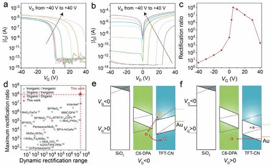图1.二维可重构不对称异质结(RAH)的栅控整流特性a)在不同正、负偏压下,二维可重构不对称异质结的转移特性曲线(ID-VG)。b)在不同栅压(-40V<VG<40V)下,正、负偏压条件下的漏极电流-漏极电压(半对数曲线。c)电流整流比随栅压变化的关系曲线。d)本研究器件与以往报道器件在最大整流比和动态整流范围上的对比。e、f)二维可重构不对称异质结在正、负偏压下,导通状态(黑色实线)与关断状态(黑色虚线)的能带结构示意图。当栅压VG<0(或VG>0)时,通过诱导载流子积累(或耗尽),可将横向P型 C6-DPA 沟道切换至导通状态(或关断状态)