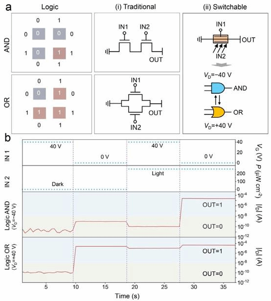 该团队通过静电栅控与偏压调制光载流子输运的协同作用,在单个器件内实现了AND门和OR门逻辑运算的实时重构。传统逻辑门通常需要至少两个晶体管组合实现,而该单器件方案将功能密度有效提升一倍。当漏极偏压为- 40 V时,器件表现出AND逻辑行为;将偏压反向至40 V,逻辑功能则切换为OR,且在多次循环测试中性能稳定,无明显衰减。