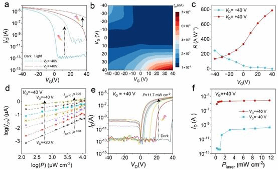 图2.二维可重构不对称异质结(RAH)的偏压调制光响应不对称性a)在暗态(实线)和 405 nm 激光照射下(虚线),当漏极电压VD固定- 40 V(蓝色曲线)或40 V(红色曲线)时,二维可重构不对称异质结的转移特性曲线 b)光电流随漏极电压和栅压变化的二维分布图。c)光响应度随栅压变化的关系曲线。d)在20 V 至- 40 V的不同栅压下,光电流与激光功率密度的关系曲线。e)当栅压固定为 40 V,激光功率密度在0.24 mW・cm⁻² 至11.7 mW・cm⁻² 范围内变化时,二维可重构不对称异质结的漏极电流 - 漏极电压曲线。f)当栅压固定为 40 V、漏极电压固定为 ±40 V 时,漏极电流随激光功率密度变化的关系曲线