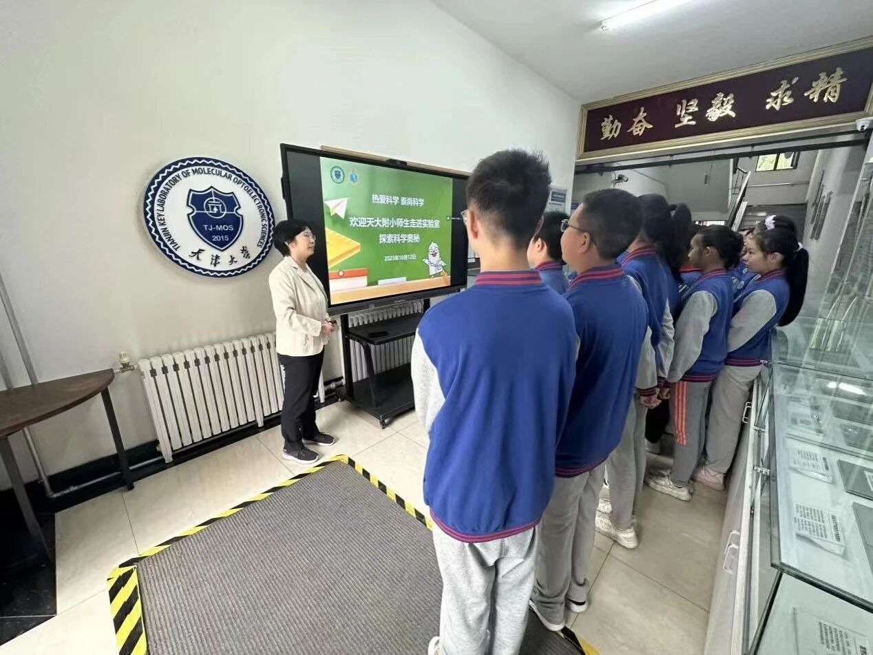 2023年10月12日下午,受天津大学理学院有机集成电路教育部重点实验室、天津市分子光电科学重点实验室邀请,天津大学附属小学六年级五班全体师生在薄校长和杜老师的带领下,走进实验室进行科普实践活动。本次活动得到实验室主任天津大学常务副校长胡文平教授及实验室师生的大力支持。