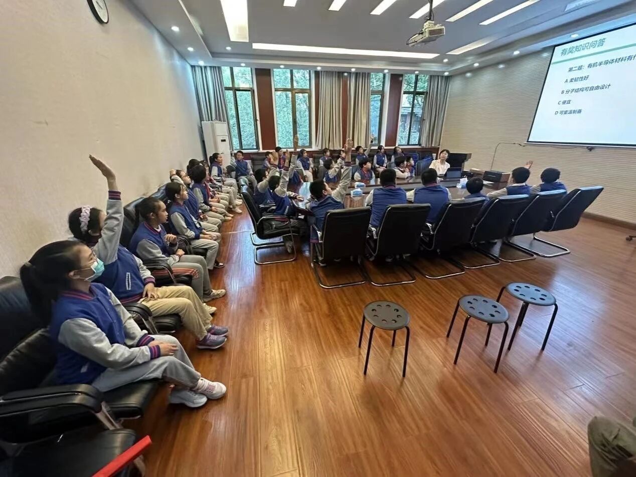 最后,同学们进入会议室观看了有机柔性材料器件相关科普小动画,并进行了有奖知识竞答。所有同学认真观看视频并非常踊跃地回答了所有问题,将所听所学灵活运用。