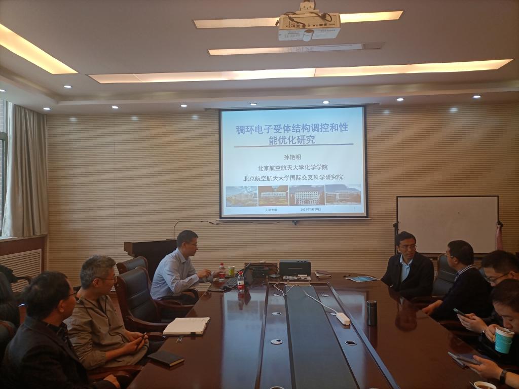 2023年3月20日,受天津大学胡文平教授邀请,北京航空航天大学孙艳明教授在天津大学卫津路校区第三教学楼会议室开展了题为“稠环电子受体结构调控和性能优化研究”的学术报告。