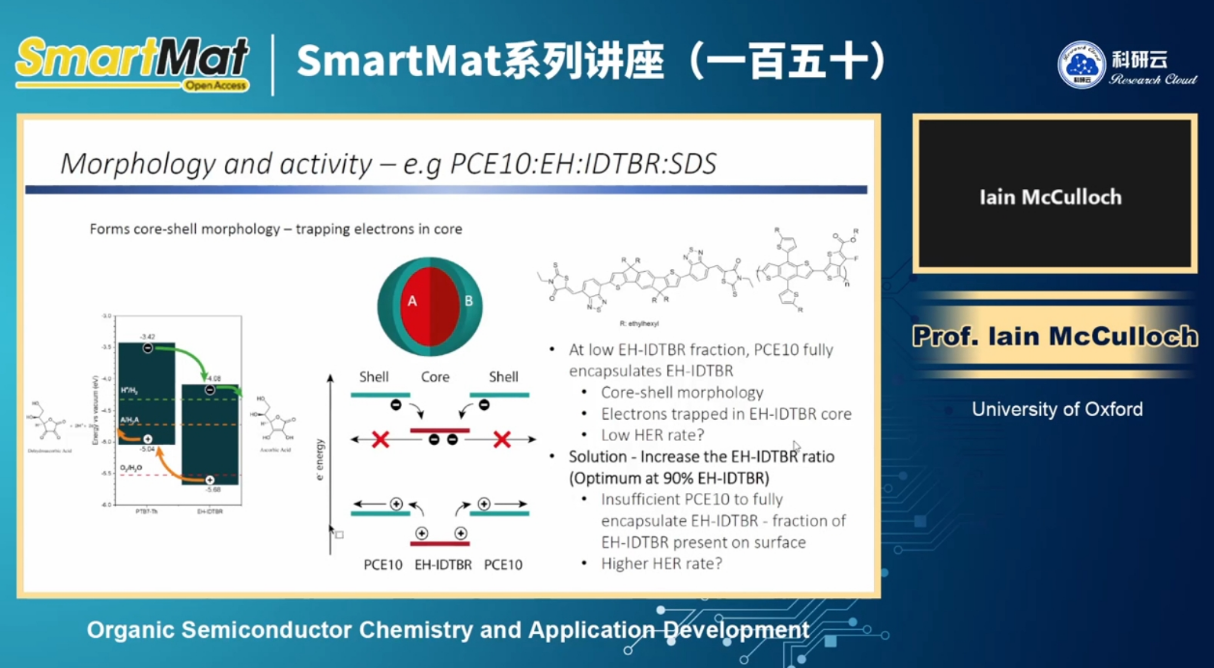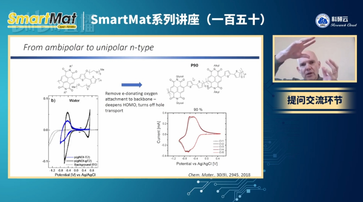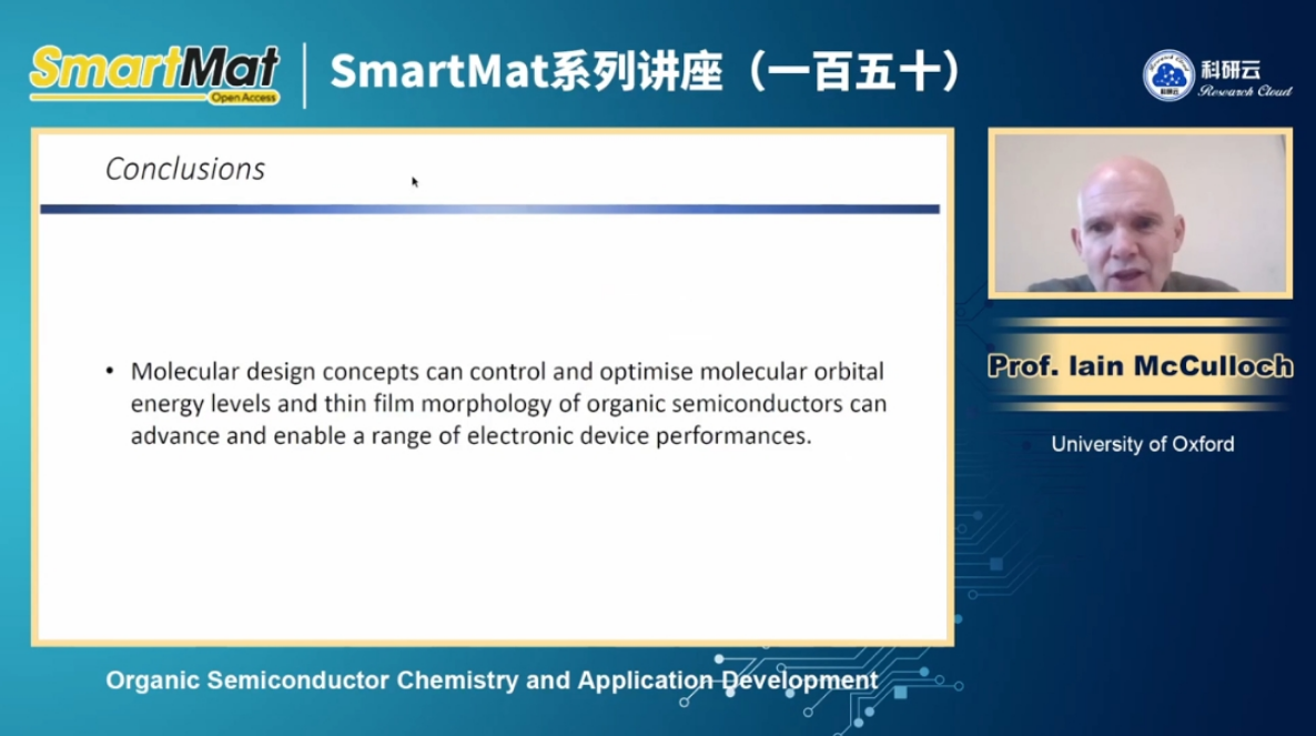 有机半导体可广泛应用于柔性显示、透明太阳电池、生物传感器、太阳燃料等,了解有机半导体化学设计对性能的影响至关重要。Iain McCulloch在报告中表示,为建立基本的结构性能关系,McCulloch教授课题组探索了一系列合成策略、研究分子设计以及相关分子形态和光电特性。McCulloch教授介绍了半导体聚合物的设计表征及其薄膜形态、在场效应和电化学晶体管中电荷输运性能提升等内容。此外,McCulloch教授还介绍了相关研究在太阳燃料中的新兴应用。