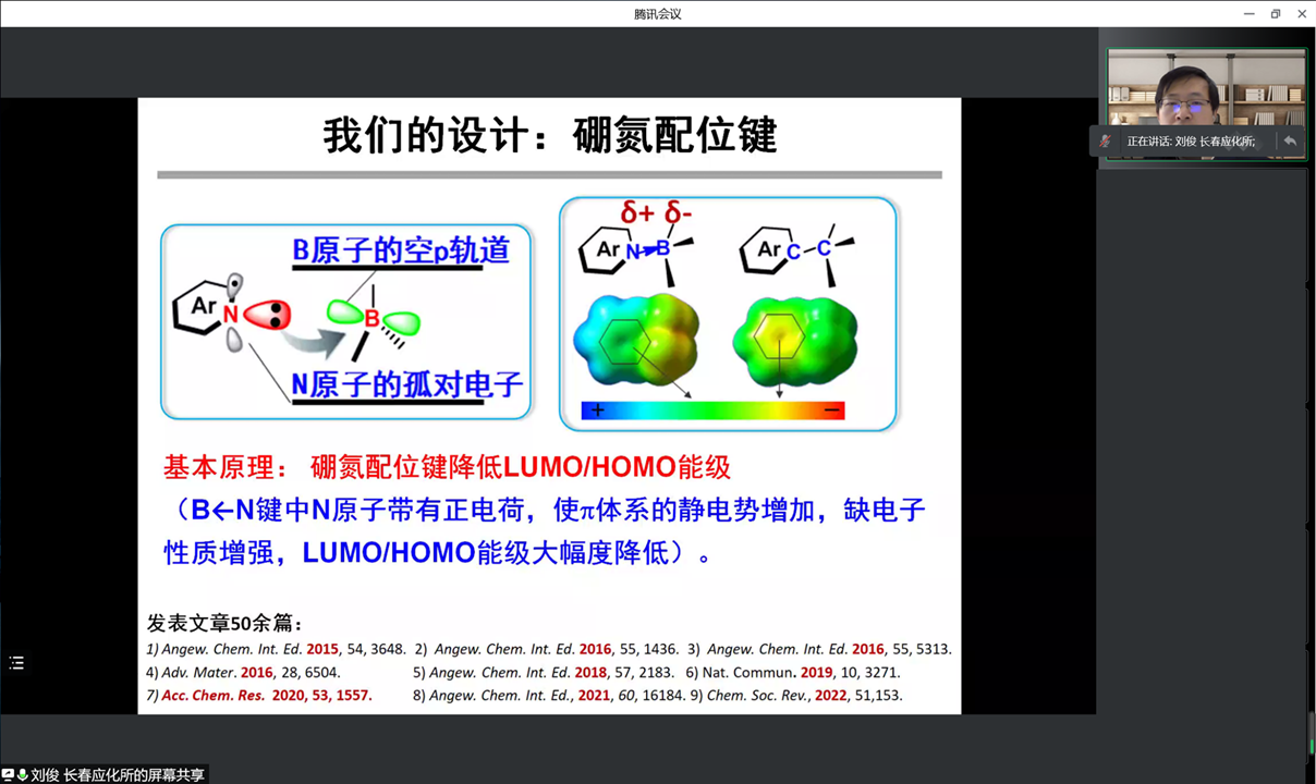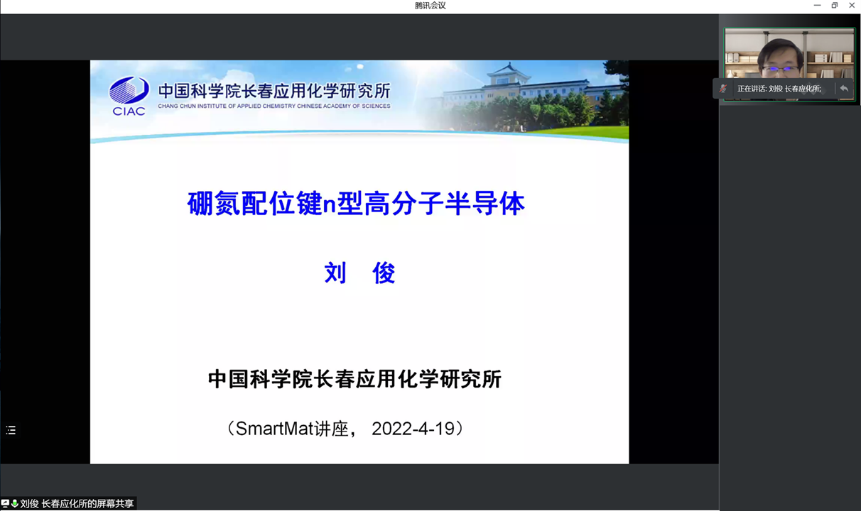 2022年4月19日,受天津大学胡文平教授及香港城市大学张华教授邀请,中国科学院长春应用化学研究所刘俊研究员和中国科学技术大学尤业字教授通过bilibili(哔哩哔哩)、百度、抖音和腾讯会议等直播平台同步分别直播了题目为“硼氮配位键n型高分子半导体”和“靶向肿瘤细胞膜上磷脂酰丝氨酸的纳米抗肿瘤药物研究”的学术报告。