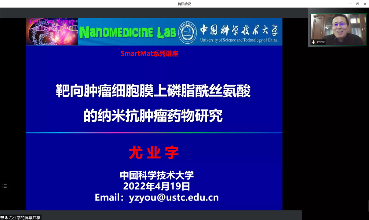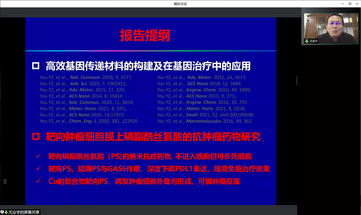 随后,尤业字教授进行了学术报告。尤业字教授介绍了肿瘤细胞内膜的磷脂酰丝氨酸外翻到外膜是细胞发生癌变的标志之一,尤教授课题组以外翻磷脂酰丝氦酸为靶点设计、构建新型纳米药物。这项工作包括合成了对肿瘤细胞膜表面特有的磷脂酰丝氨酸有高特异性结合作用的多功能纳米材料,发展了靶向PS的纳米材料和构建了靶向PS的纳米粒子等三个步骤。报告结束后,尤业字教授与参会师生展开交流与讨论,深入研究了抗肿瘤纳米药物的相关问题。