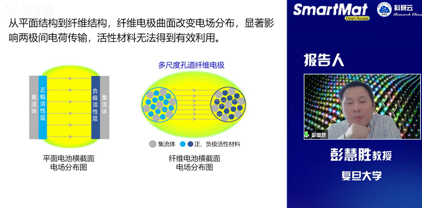 彭教授首先介绍了器件结构的演化,纤维电子器件的特点以及在可穿戴设备、新能源、信息技术、物联网、人工智能、大健康、空间探测等领域的巨大应用前景。彭教授指出,锂离子电池等化学电池面临的挑战包括其刚性结构及安全性问题。为满足可穿戴和可植入电子器件等重要新型领域的迫切发展需要,彭教授课题组就纤维聚合物锂离子电池相关工作做了深入研究并真正实现了产业化。报告中,彭教授指出从平面结构到纤维结构,其电场分布、电荷传输和界面均发生明显变化,需要进行全新的结构设计。彭教授介绍了如何通过技术及工艺手段确保构建纤维聚合物电池的全柔性及安全性,并概述了大规模快速生产的途径。