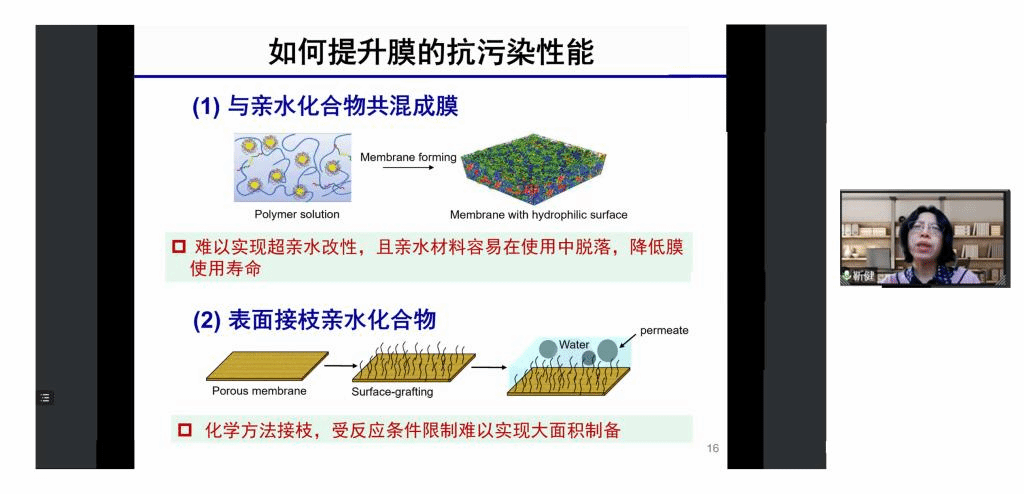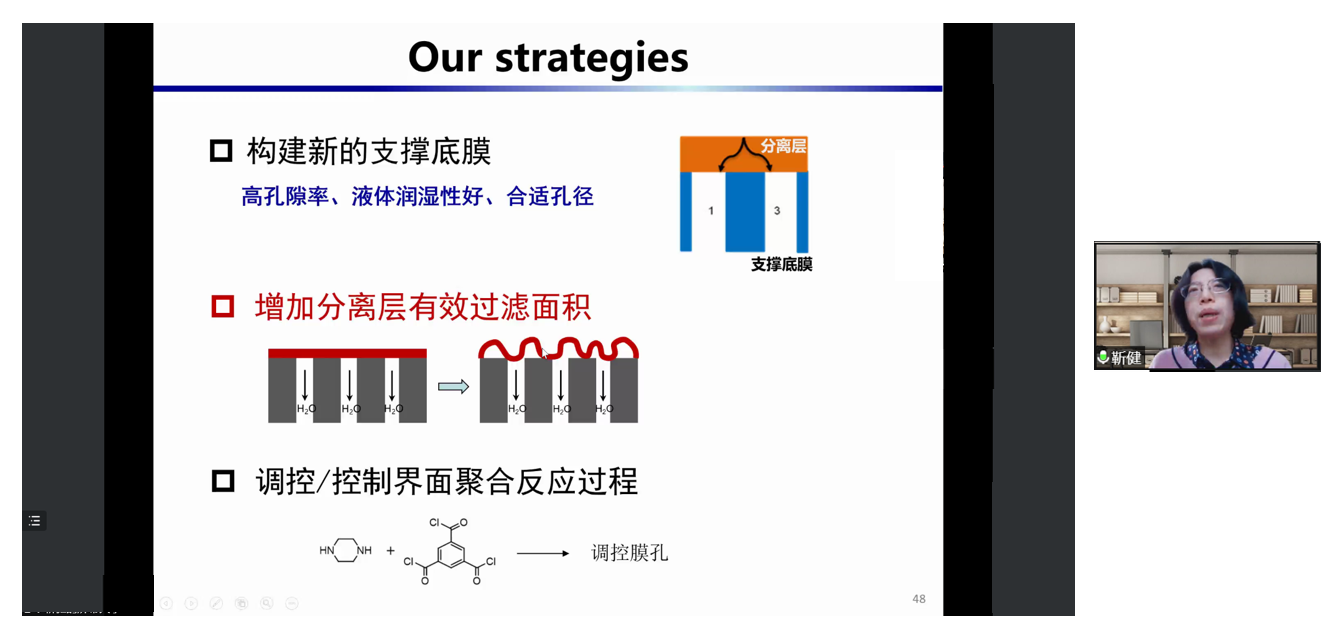 在报告中,靳健教授就油水分离膜、纳滤膜两方面进行汇报。靳教授团队以精确分离为目标进行膜材料设计,很好地实现了膜抗油粘附及较好的耐盐稳定性。另外,通过构建新的支撑底膜,增加分离层有效过滤面积以及调控界面聚合反应过程等方式改性传统纳滤膜,实现了膜材料均一的孔径及优异的分离性能。报告后,靳健教授与参会师生深入探讨了膜材料亲水改性接枝的方法和原理,并交流了工业实际应用中所遇到的相关问题。