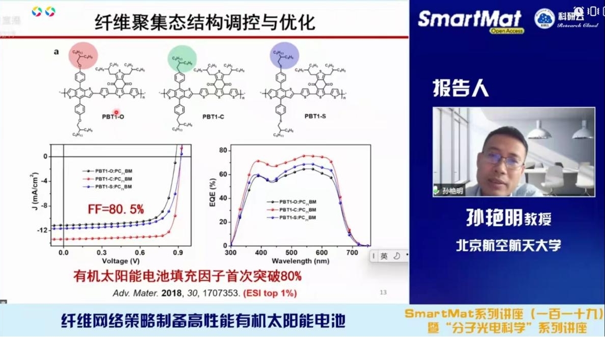 2022年4月6日,受天津大学胡文平教授及香港城市大学张华教授邀请,北京航空航天大学孙艳明教授通过bilibili(哔哩哔哩)、百度、YouTube等直播平台同步直播了题为“纤维网络策略制备高性能有机太阳能电池”的学术报告。