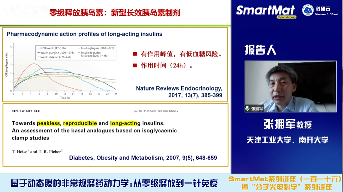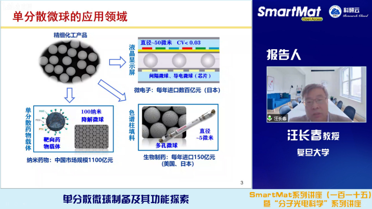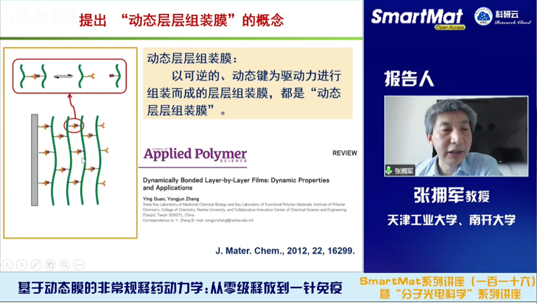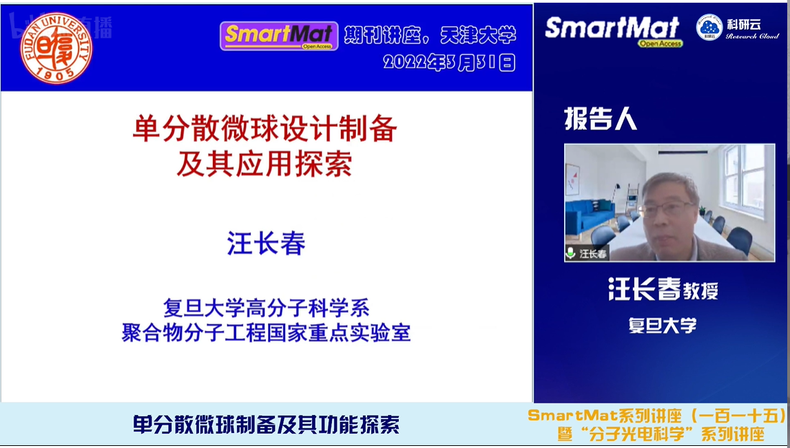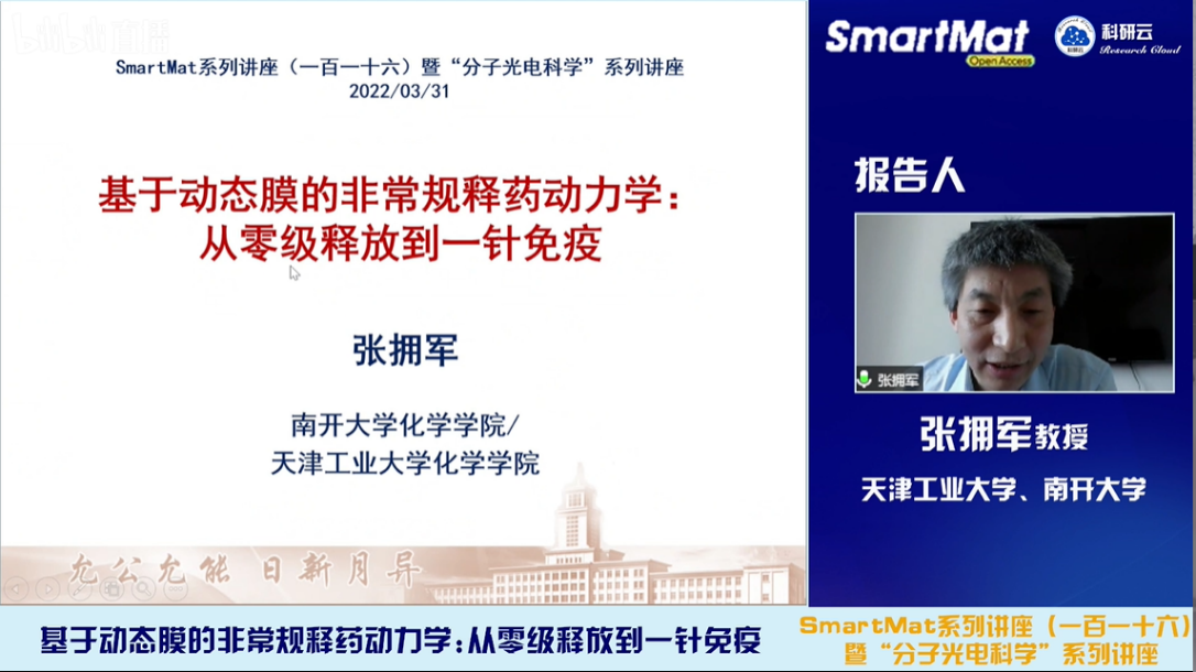 2022年3月31日,受天津大学胡文平教授及香港城市大学张华教授邀请,复旦大学汪长春教授和南开大学/天津工业大学张拥军教授通过bilibili(哔哩哔哩)、百度、YouTube等直播平台同步分别直播了题目为“单分散微球设计制备及其应用探索”和“基于动态膜的非常规释药动力学:从零级释放到一针免疫”的学术报告。