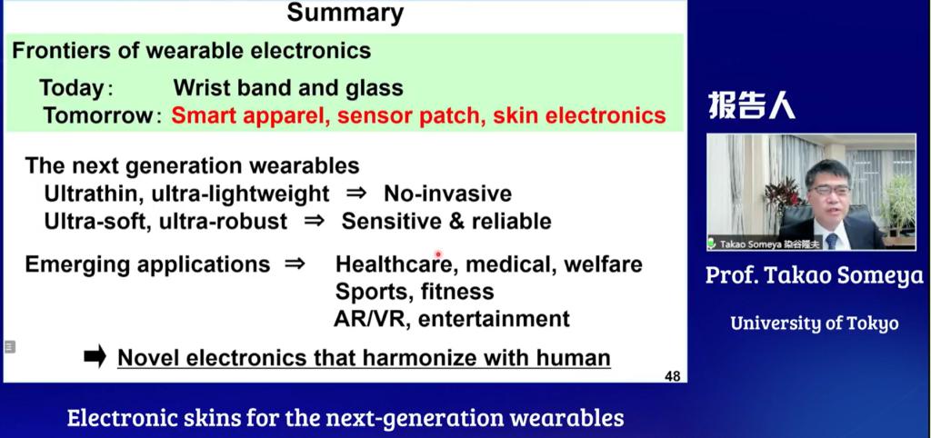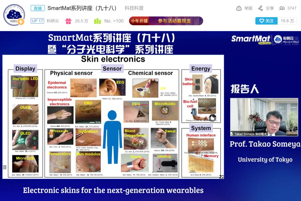2022年1月19日,受胡文平教授邀请,日本东京大学Takao Someya教授通过bilibili(哔哩哔哩)、百度、YouTube等直播平台同步直播了题目为“Electronic Skins for the Next-generation Wearables”的线上报告。在报告中,Takao Someya教授就可拉伸电子器件、超薄电子器件、纳米网状电子器件三大方面进行汇报,深入探讨了可拉伸薄膜器件在医疗应用和可穿戴设备方面的研究进展,并讨论电子皮肤目前存在的问题和未来前景。电子皮肤的最终目标是在自然条件下对人类活动进行无创测量,增强与人类皮肤之间的相互作用。其中,通过提高贴合性和可拉伸程度,可以将超薄半导体膜直接层压到皮肤上,该紧密的贴合有利于对健康状况进行长时间的连续监测,从而实现医疗保健的个性化。Someya教授表示,如何提升系统稳定性是未来发展的主要目标之一。讲座吸引科研云-B站、科研云-斗鱼、科研云-视频号、科研云-百度、科研云-YouTube、科研云-Facebook、科研云官网等直播平台相关领域专业观众累计4.1万余人在线参与观看。