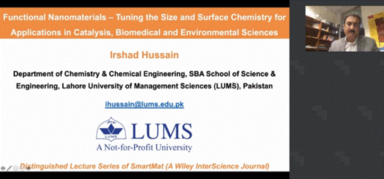 2020年12月18日,受 SmartMat编委会、天津市分子光电科学重点实验室、科研云、能源学人邀请,巴基斯坦拉合尔管理科学大学Irshad Hussain教授通过bilibili(哔哩哔哩),百度,YouTube等直播平台同步直播了题目为“Functional Nanomaterials-Tuning the Size and Surface Chemistry for Applications in Catalysis, Biomedical and Environmental Sciences”的学术报告。Hussain教授在本次讲座中概述了可定制大小和表面化学性质的金属纳米粒子、纳米团簇的合成及其在生物医学和可再生能源技术等方面的应用。本次讲座得到了广泛关注,观众反响热烈。