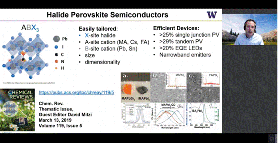 11月26日,受 SmartMat编委会、天津市分子光电科学重点实验室、科研云、能源学人邀请,美国华盛顿大学西雅图分校David S. Ginger教授通过bilibili(哔哩哔哩),百度,YouTube等直播平台同步直播了题目为“Solar Surfaces: Defects and Interfaces in Halide Perovskite Semiconductors”的学术报告。Ginger教授在本次讲座中描述了卤化物钙钛矿缺陷的起源, 通过缺陷化学钝化来实现材料光电性能,讨论了在三维、二维钙钛矿中缺陷对离子传输过程的影响,以及在提高太阳能电池和发光二极管性能方面的应用。本次讲座得到了广泛关注,观众反响热烈。