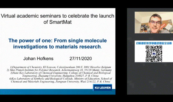 11月27日,受SmartMat编委会、天津市分子光电科学重点实验室、科研云、能源学人邀请,比利时鲁汶大学Johan Hofkens教授通过bilibili(哔哩哔哩),百度,YouTube等直播平台同步直播了题目为“The power of one: From single molecule investigations to materials research”的学术报告。Hofkens教授在本次讲座中概述了近期单分子实验和新显微镜模式的发展如何推进发射银团簇以及钙钛矿纳米粒子和薄膜的研究。本次讲座得到了广泛关注,观众反响热烈。