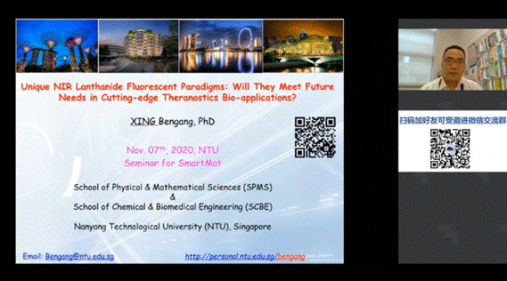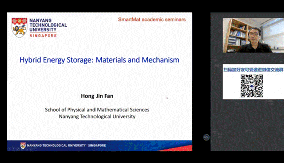 11月7日,受 SmartMat编委会、天津市分子光电科学重点实验室、科研云、能源学人邀请,南洋理工大学化学与生物医学工程学院Xin Wang教授,南洋理工大学物理和数学学院,化学与生物医学工程学院Bengang Xing教授,新加坡国立大学化学系,物理系Wei Chen教授以及南洋理工大学物理和数学学院Hong Jin Fan教授通过bilibili(哔哩哔哩),百度,YouTube等直播平台同步直播了题目分别为“Investigation of Heterogeneous Molecular Catalysts for Electrocatalytic Applications”,“Unique NIR Lanthanide Fluorescent Paradigms: Will They Meet Future Needs in Cutting-edge Theranostics Bio-Applications?”,“Interface Engineering: Molecular Self-Assembly and Electronic Structures”以及“Hybrid Energy Storage: Materials and Mechanism” 的学术报告。本次讲座得到了广泛关注,bilibili,百度直播,YouTube等平台累积观看人数超过8.3万,观众反响热烈。