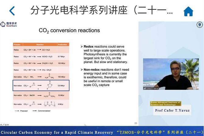2020年9月16日,受天津市分子光电科学重点实验室邀请,韩国科学技术高等研究院Cafer T. Yavuz教授通过Zoom平台向广大师生做了题为“Circular Carbon Economy for a Rapid Climate Recovery”的线上讲座。Yavuz教授就碳循环经济背景下的高效碳捕捉技术进行了详细的介绍。Yavuz教授课题组关于碳捕捉技术的研究对改善全球温室效应具有重要意义。本次讲座受到海内外学术界的广泛关注,讲座后,Yavuz教授与师生进行了在线交流与探讨。