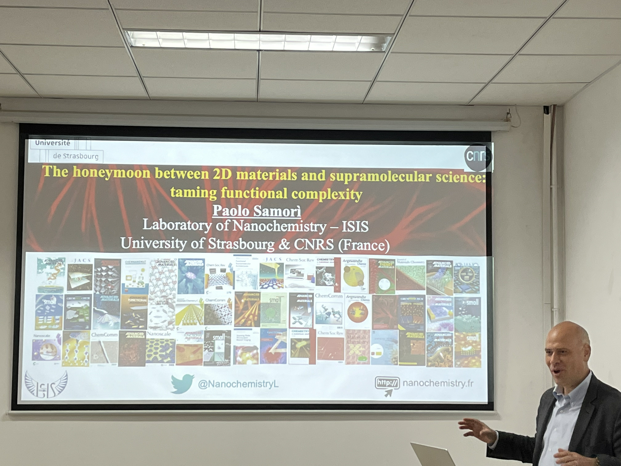 在讲座中,Paolo Samorì教授首先介绍了二维材料的基本特性及其在现代科技领域中的广泛应用。随后,他详细阐述了如何通过分子开关技术,以对称或不对称的方式精确控制二维材料(如MoS2、黑磷或WSe2)的表面接口,从而赋予这些材料独特的电学、光学和力学特性。这种功能化策略不仅拓宽了二维材料的应用范围,还为实现基于二维材料的晶体管对多种独立刺激的响应提供了可能。此外,Paolo Samorì教授还分享了他们在利用工程活性材料开发高灵敏度物理传感器方面的最新进展,这些传感器在医疗诊断、健康监测和人机交互等领域展现出巨大的应用潜力。