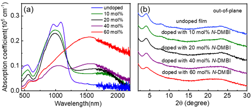 降低结晶度可以改善高分子材料和掺杂剂的共混,获得高的掺杂效率。然而,受限于掺杂后极化子的离域程度,低结晶度的高分子材料仍难以获得高的热电性能。为了解决这一问题,天津大学邓云峰教授基于噻吩取代吡咯并吡咯二酮(ThDPP)与氰基取代苯并噻二唑(CNBTz),利用双受体策略合成了低结晶性的高分子材料ThDPP-CNBTz。相较于ThDPP-BTz,氰基的引入能够有效降低前线轨道能级,使得聚合物从双极传输转变为n型传输。得益于其低的结晶性,ThDPP-CNBTz与掺杂剂分子具有良好的相容性,掺杂剂的引入对薄膜堆积结构影响较小,从而保持好的载流子传输通道。同时,由于双受体的存在,可以显著提升掺杂后极化子的离域程度。