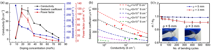 经N-DMBI掺杂后,ThDPP-CNBTz表现出优异的热电性能,最优掺杂比例下的电导率为50.6 S cm-1,功率因子最高可达126.8 mW m-1 K-2。此外,ThDPP-CNBTz低的结晶性有利于制备对机械形变不敏感的柔性器件。以PET为基底制备柔性热电器件的率因子可达70 mW m-1 K-2,在弯折半径为3 mm时,经600次弯折循环后器件的电导率仍能维持90%左右。该工作为发展高性能n型有机热电器件,尤其是柔性器件,材料开辟了新的道路。