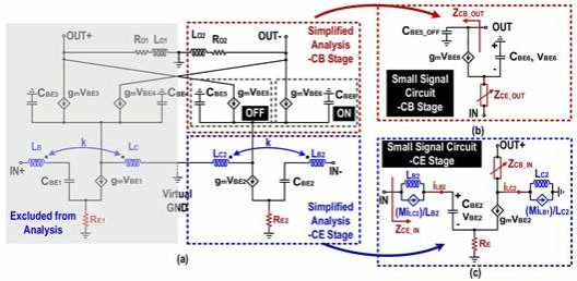 图1. 带有负反馈磁耦合(NFMC)补偿的阻抗不变可变增益放大器(IIVGA)的小信号等效电路。(a)用于简化分析的整体电路结构(b)共基极(CB)级的小信号模型(c)共射极(CE)级的小信号模型